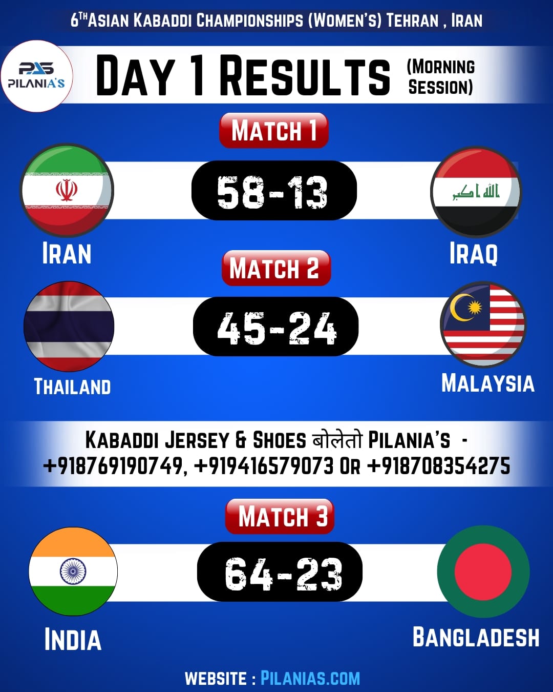 MATCH 6 RESULT: INDIA 76 – THAILAND 21